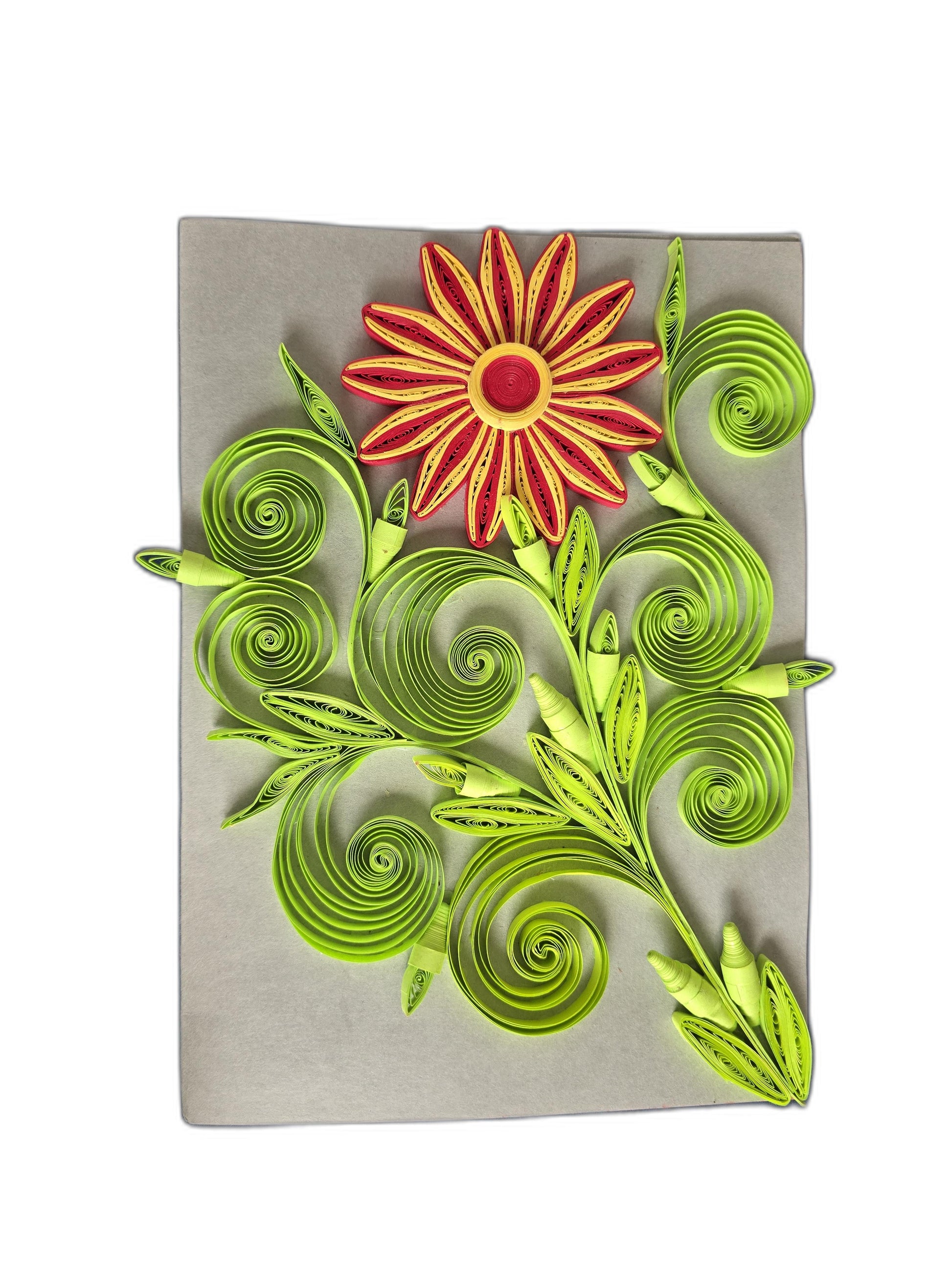 A vibrant quilling artwork featuring a red-and-yellow flower with green leaves, carefully curled and arranged on a neutral background. Made in 2 days by differently-abled children, this eco-friendly artwork adds an elegant, handcrafted touch to your walls.